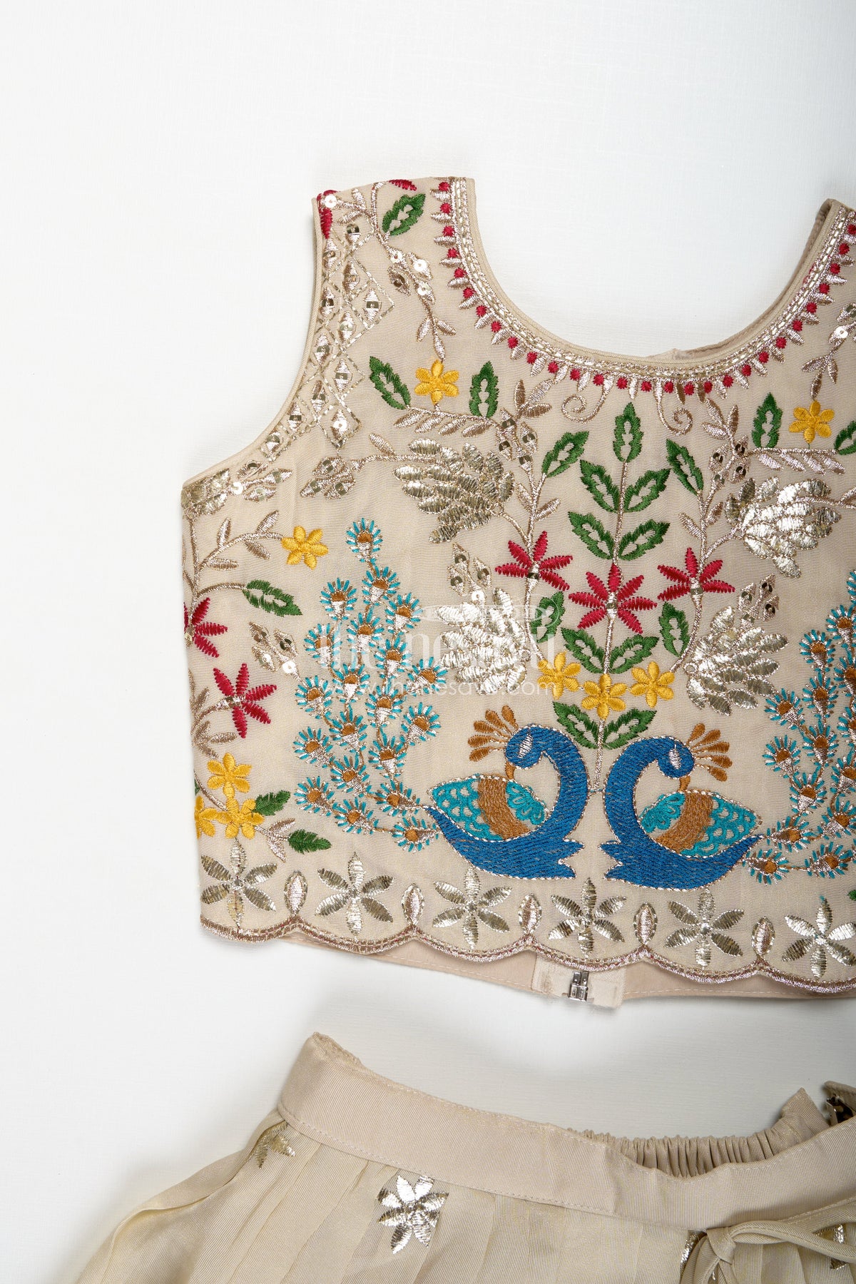 Dress lacha creations don’t get more enchanting than this beautifully embroidered girls lehenga choli set. Crafted in rich Kora silk cotton, the beige base is intricately adorned with vivid threadwork depicting peacocks, deer, trees, and butterflies—creating a fairy tale right on the fabric. The sleeveless blouse features matching embroidery with a modern cut, and the flared lehenga flows with elegant pleats and tassels for a perfect twirl. Complete with a light dupatta, this outfit blends festive tradition with dreamy design, making it a show-stopper for weddings, celebrations, or cultural occasions.