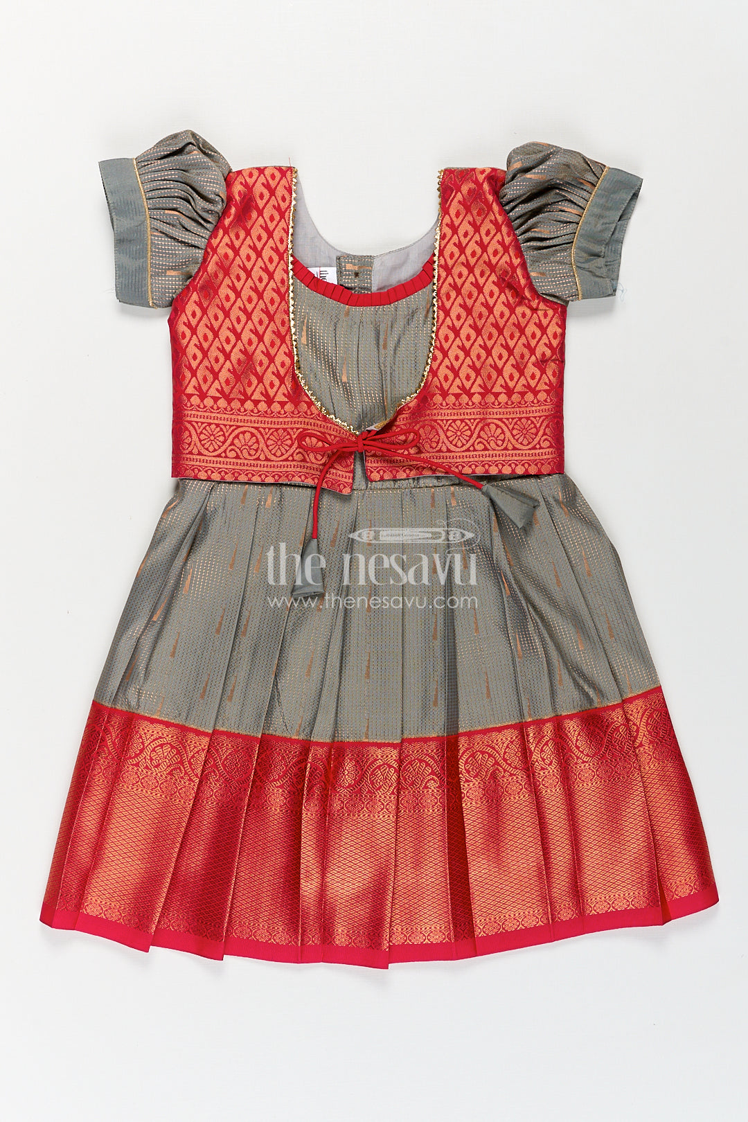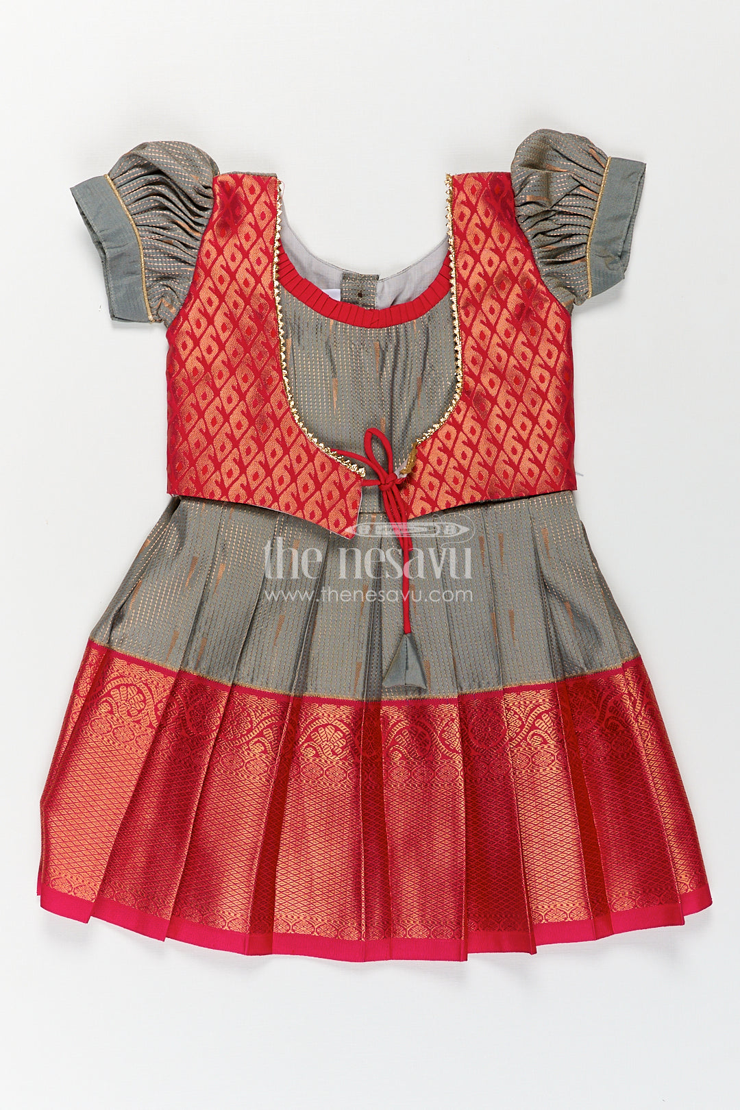 This long pattu frock is a sophisticated and festive choice designed to celebrate tradition in elegant fashion. Made from semi kanchivaram silk, the dress showcases a soothing grey body detailed with golden zari motifs that shimmer under light. The contrast red overlay bodice is woven with intricate patterns and features a front tie-up with tassels for an added traditional flair. Short puff sleeves complement the design, offering a refined silhouette with a playful edge. The frock’s highlight lies in its extended pleated skirt, finished with an elaborate red zari border that adds length, richness, and grace to the outfit. Perfect for weddings, temple visits, and festive gatherings, this long pattu frock ensures your little one is dressed in heritage style without compromising comfort. Its breathable fabric, graceful cut, and charming color contrast make it a timeless piece for every special occasion.