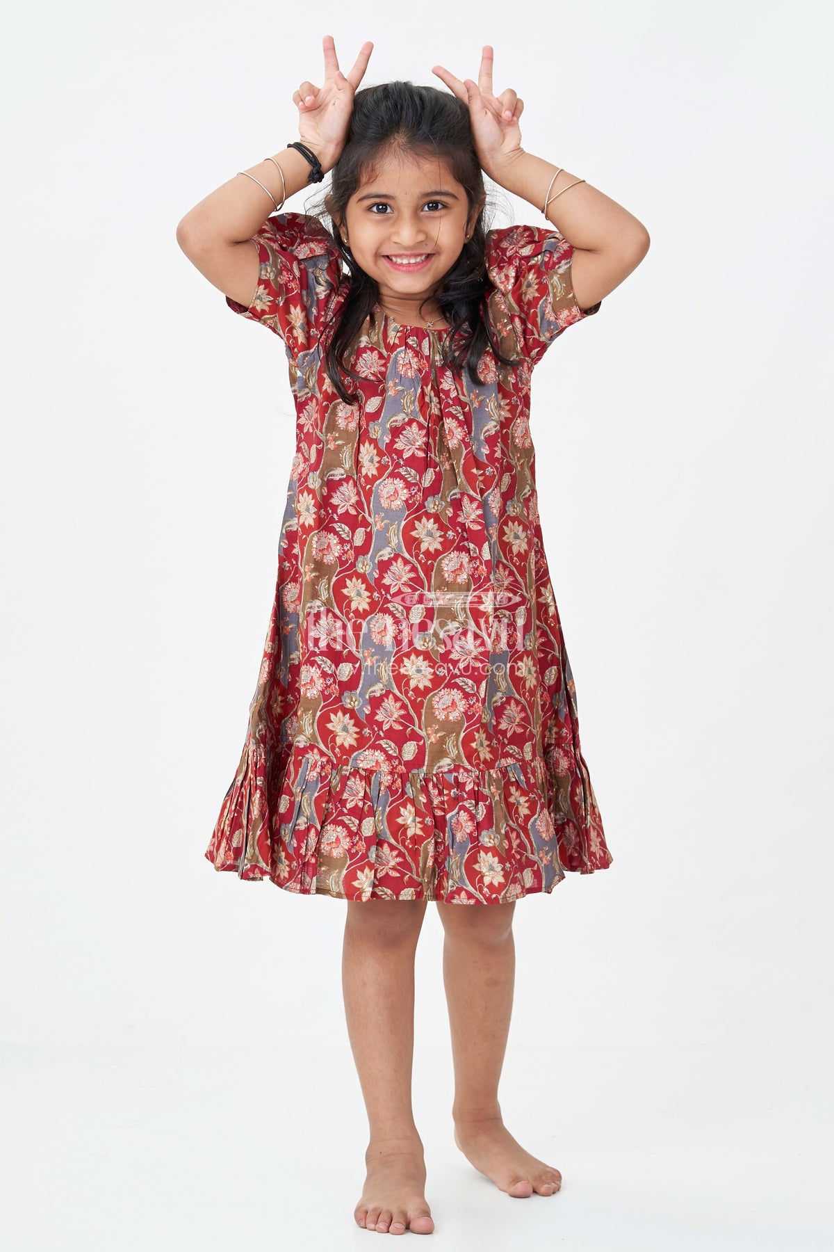 Girls Modal Silk Frock with Ruffle Hem in Red Floral Digital Print and Puff Sleeves for Chic Comfort