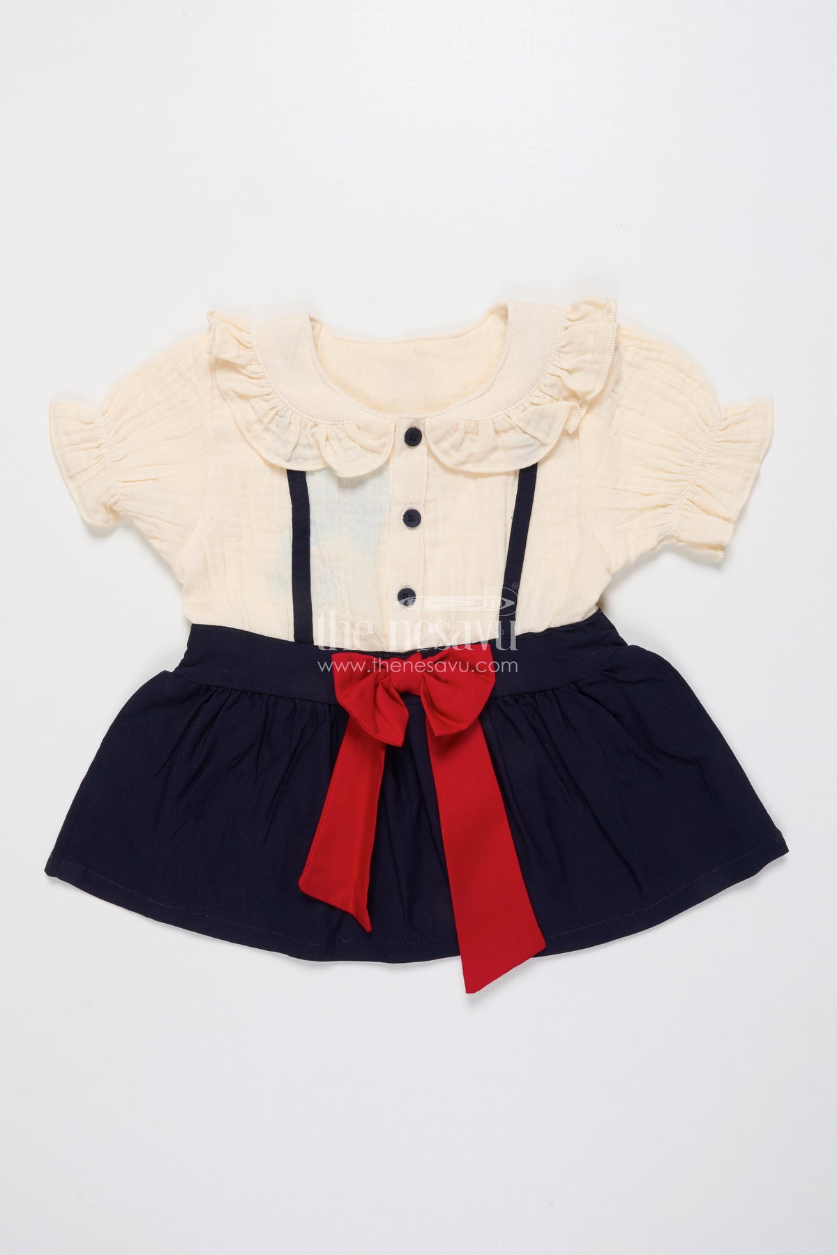 - Features a cream bodice with front buttons and a navy skirt with a bold red bow