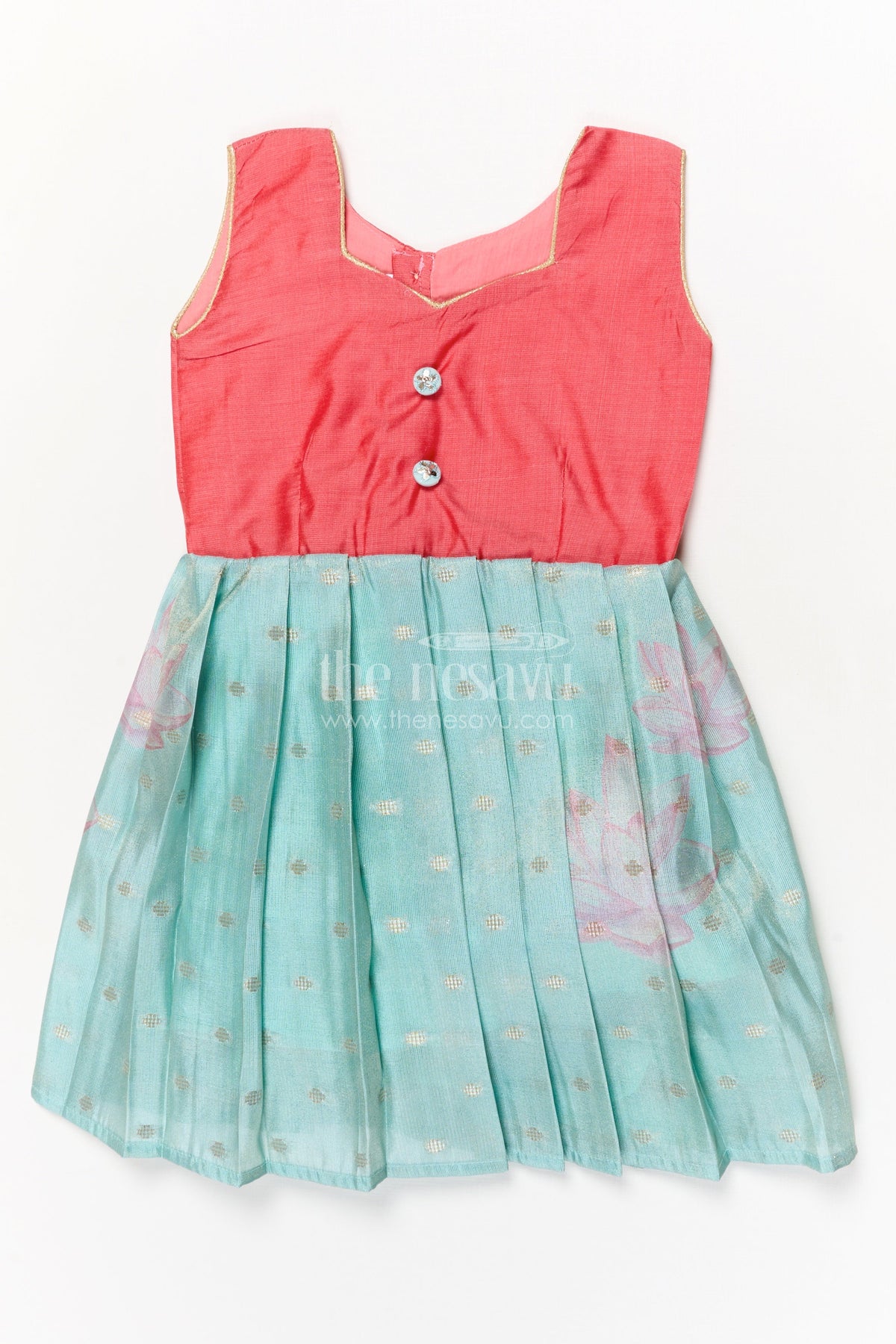 - Design: Digital lotus print, pleated skirt, buttoned yoke