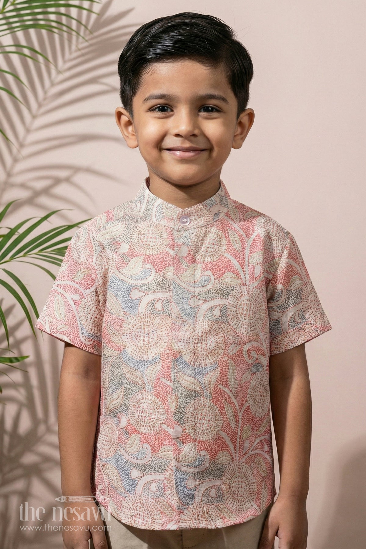 சிறுவர்களுக்கான வசதியான ரேயான் எத்னிக் மலர் பிரிண்ட் சட்டை ஸ்டைலான கோடைக்கால சாதாரண உடைகள்