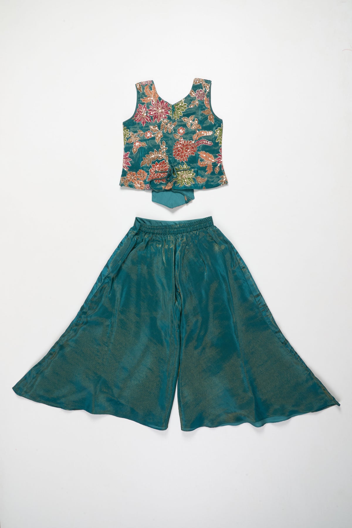 • ஃபிளேர்டு பிளாஸ்ஸோ பேன்ட் மற்றும் ஒருங்கிணைந்த எம்பிராய்டரி டாப் ஆகியவை அடங்கும்.