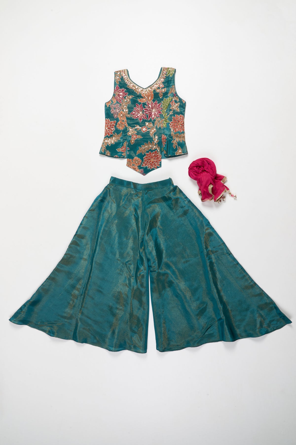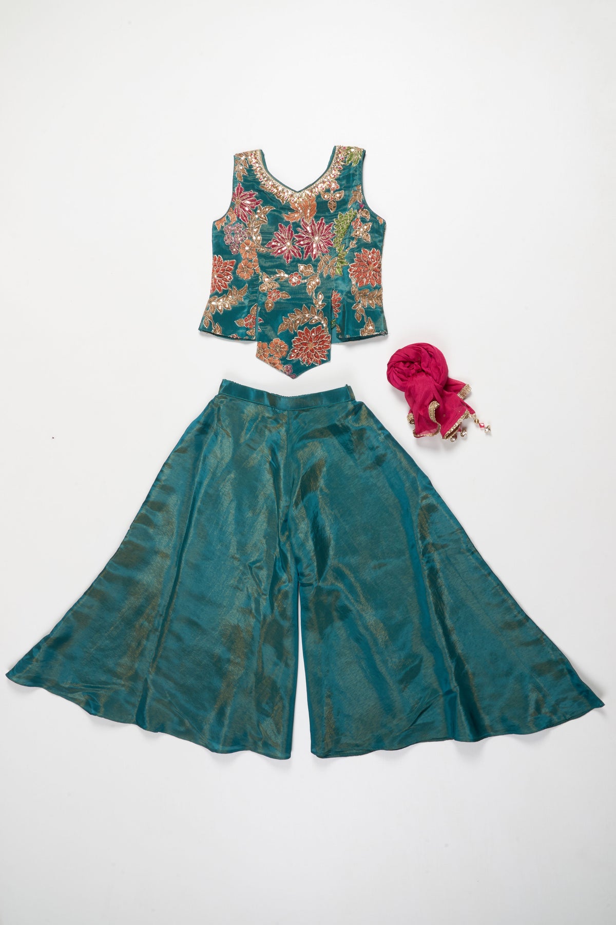 திருமணங்களுக்கான டிஜிட்டல் பிரிண்ட் மற்றும் எம்பிராய்டரி கொண்ட பெண்கள் பண்டிகை பிளாஸ்ஸோ செட்