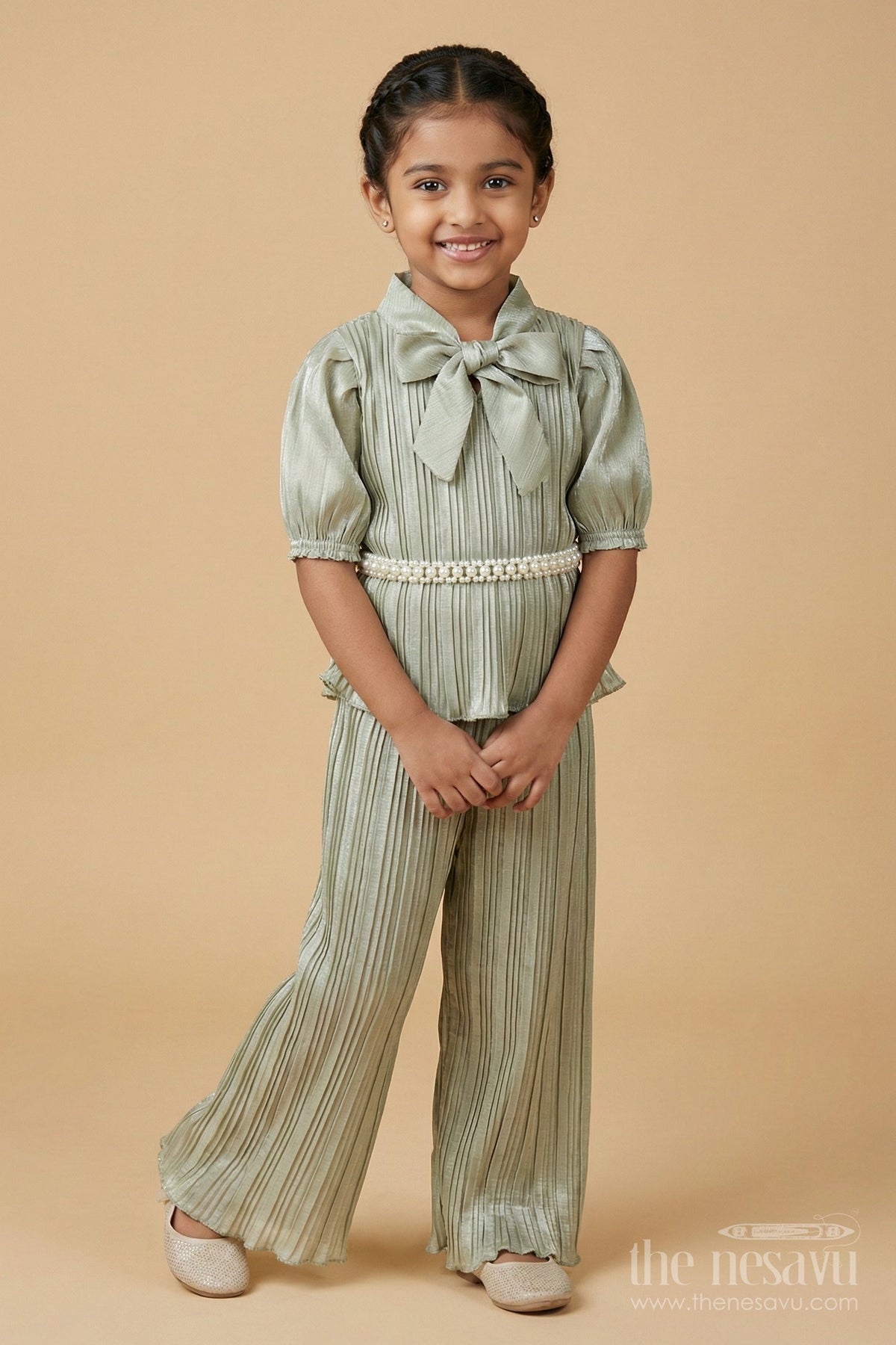 ஃபிளேர்டு பேன்ட் மற்றும் ஸ்டைலிஷ் டாப் உடன் கூடிய நேர்த்தியான பெண்கள் ப்ளீட்டட் ஜார்ஜெட் கோ-ஆர்ட் செட்