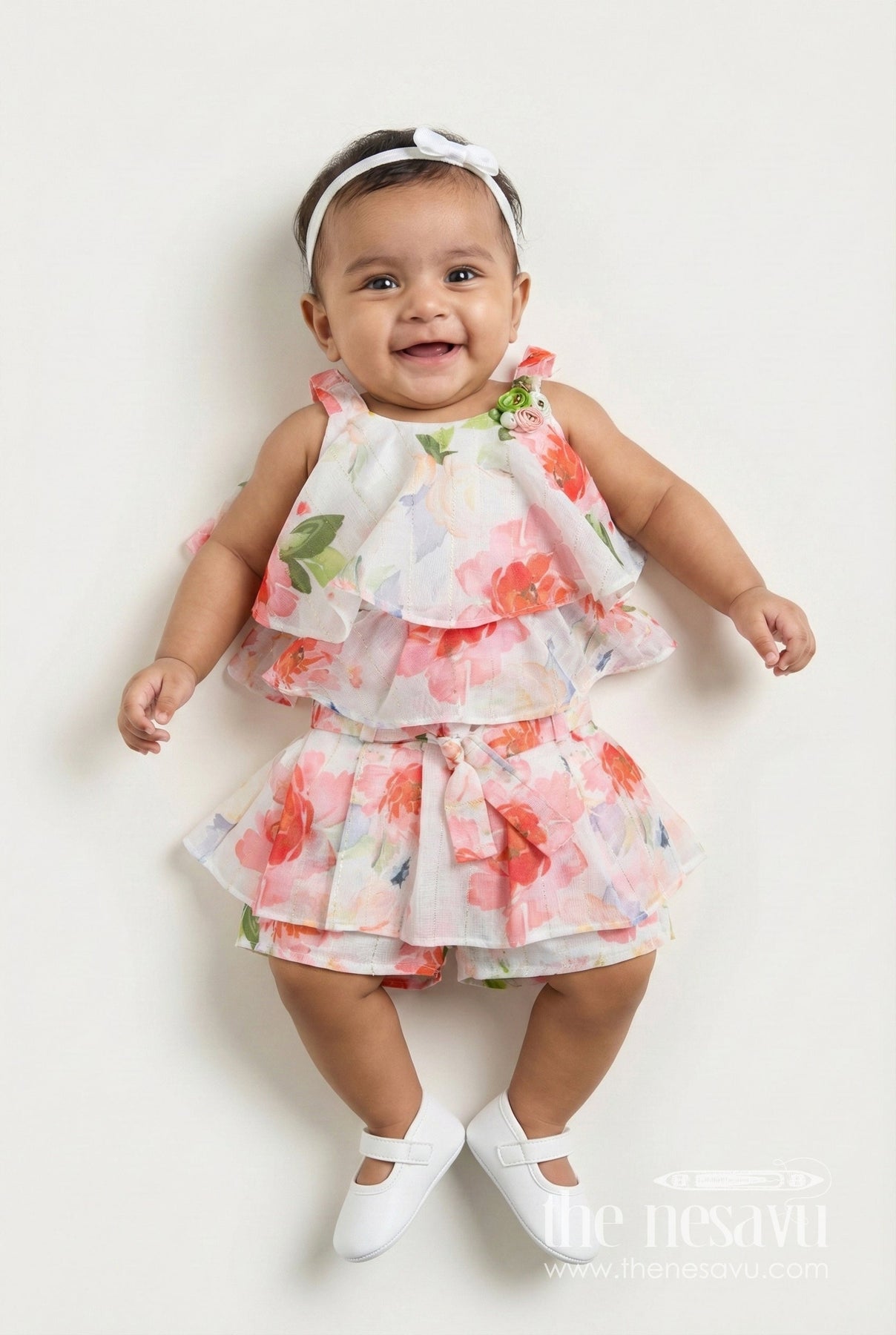 - வடிவமைப்பு: டிஜிட்டல் மலர் அச்சு, அடுக்கு மேல், வில் பெல்ட்டுடன் கூடிய ஷார்ட்ஸ்.