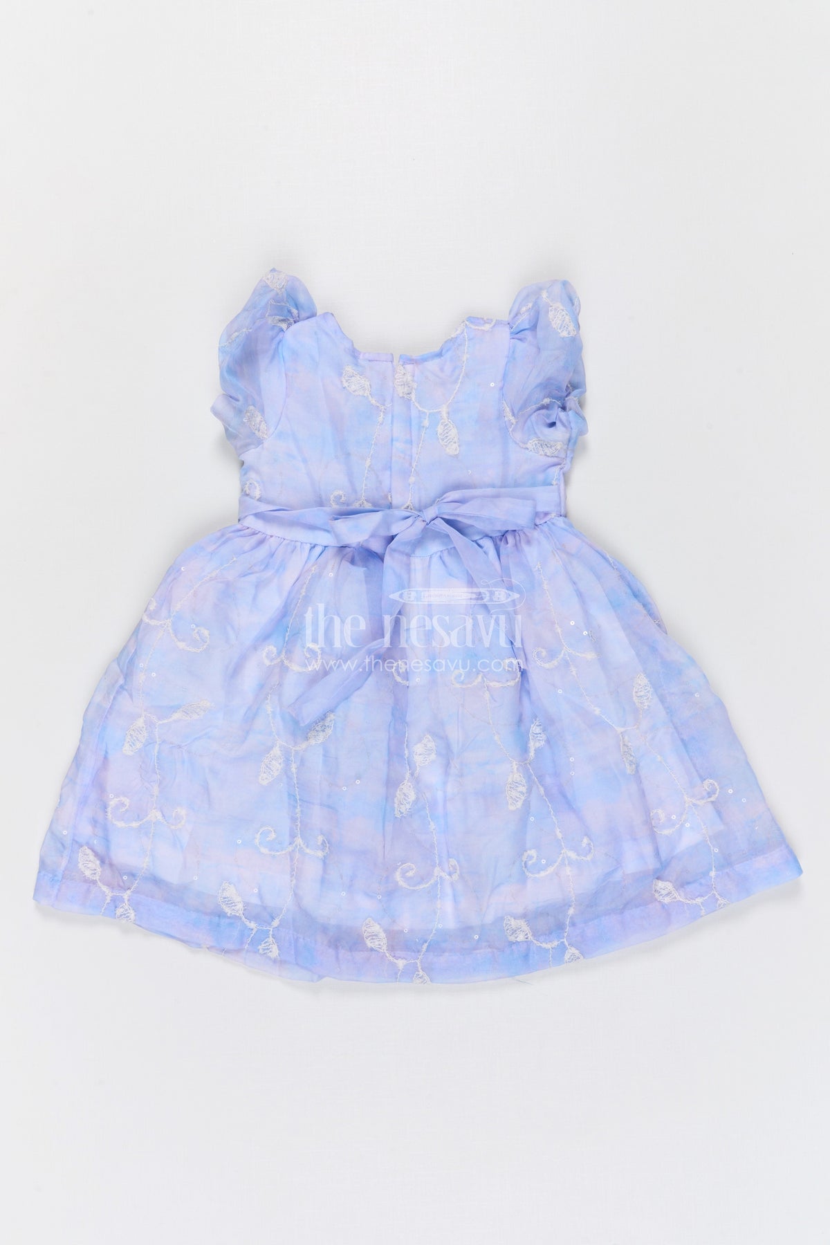 - Design: Embroidered party frock with gathered skirt and back bow