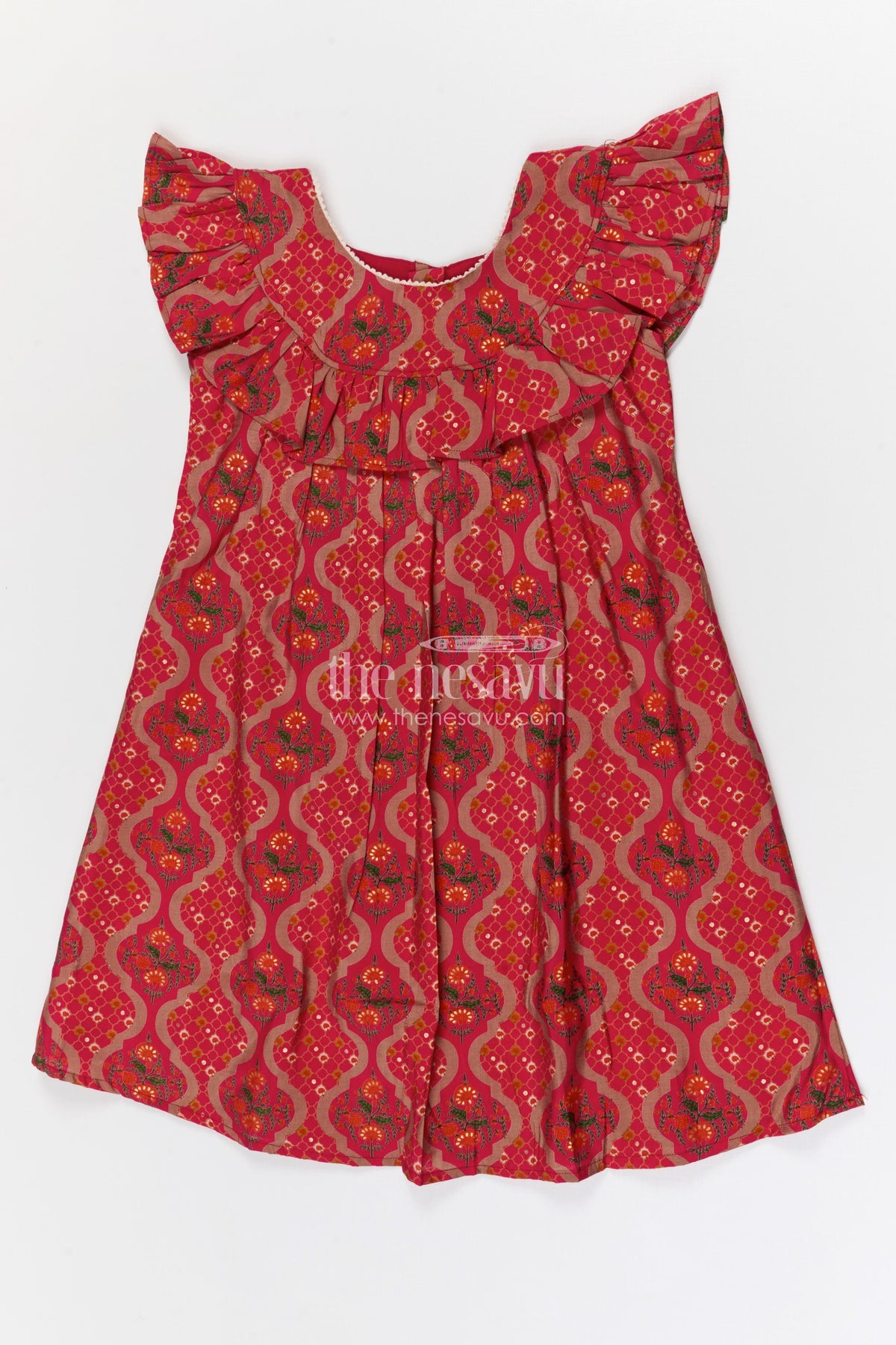The Nesavu Girls Cotton Frock Girls Printed Party Dress for Birthdays and Celebrations Nesavu 22 (4Y) / Pink / Modal GFC2122B-22 Nesavu Girls Modal Silk Printed Party Dress With Ruffle Sleeves For Birthdays And Festive Events
